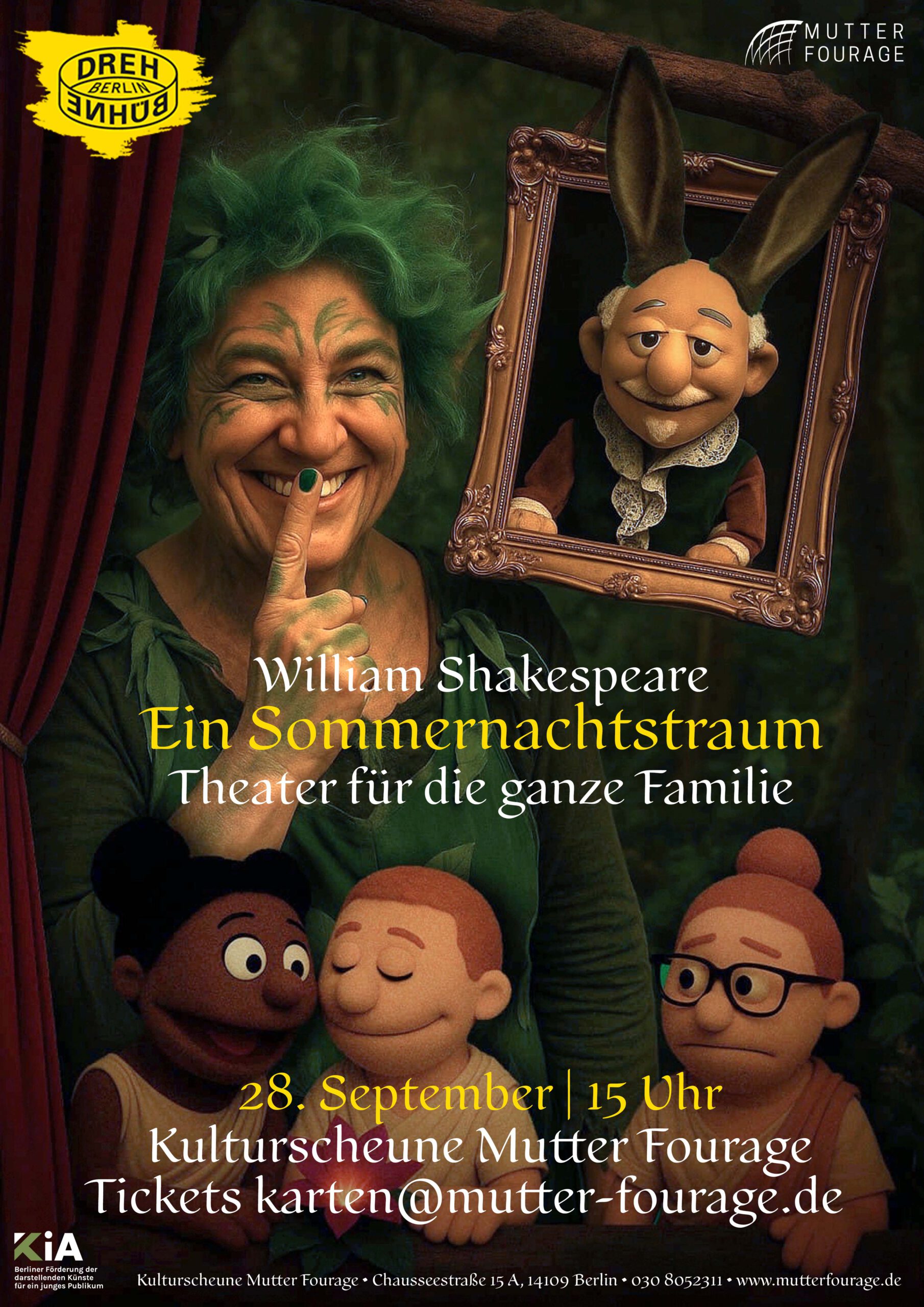 Sep. 28 15:00 - 16:00 SHAKESPEARE • Ein Sommernachtstraum • Theater mit der Drehbühne Berlin zum Erntedankfest Galerie Mutter Fourage & Kulturscheune Chausseestraße 15A, Berlin Veranstaltung Details Wegbeschreibung